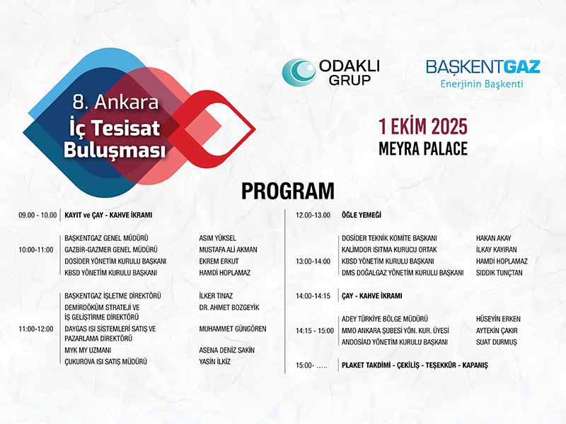 Türkiye’de iç tesisat sektörünün en önemli organizasyonu olan Ankara İç Tesisat Buluşması, bu yıl 8. kez sektör profesyonellerini bir araya getiriyor. Etkinlik, 1 Ekim 2025 tarihinde Ankara’nın seçkin mekânlarından Meyra Palace Hotel’de düzenlenecek. Başkent Doğalgaz ve Odaklı Grup iş birliğiyle düzenlenen 8. Ankara İç Tesisat Buluşması, bu yıl “Tesisat Mühendisliği:Verimli ve Akıllı Isıtma” ana […]