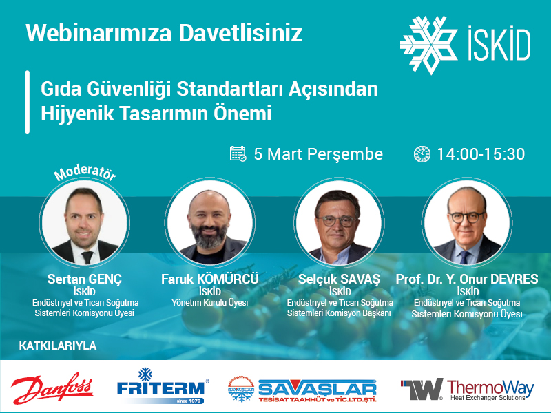 Webinarın moderatörlüğünü, Endüstriyel ve Ticari Soğutma Sistemleri Komisyonu Üyesi Sertan GENÇ üstlendi. İSKİD yönetim Kurulu Üyesi Faruk KÖMÜRCÜ’nün açılış konuşması ile başlayan webinarda, Endüstriyel ve Ticari Soğutma Sistemleri Komisyonu Başkanı Selçuk SAVAŞ “Gıdada Tarladan Mutfağa Soğuk Zincire Bakış” , Prof. Dr. Y. Onur DEVRES “ Gıda Güvenliği Standartları Açısından Hijyenik Tasarımın Önemi” sunumlarıyla yer aldılar.